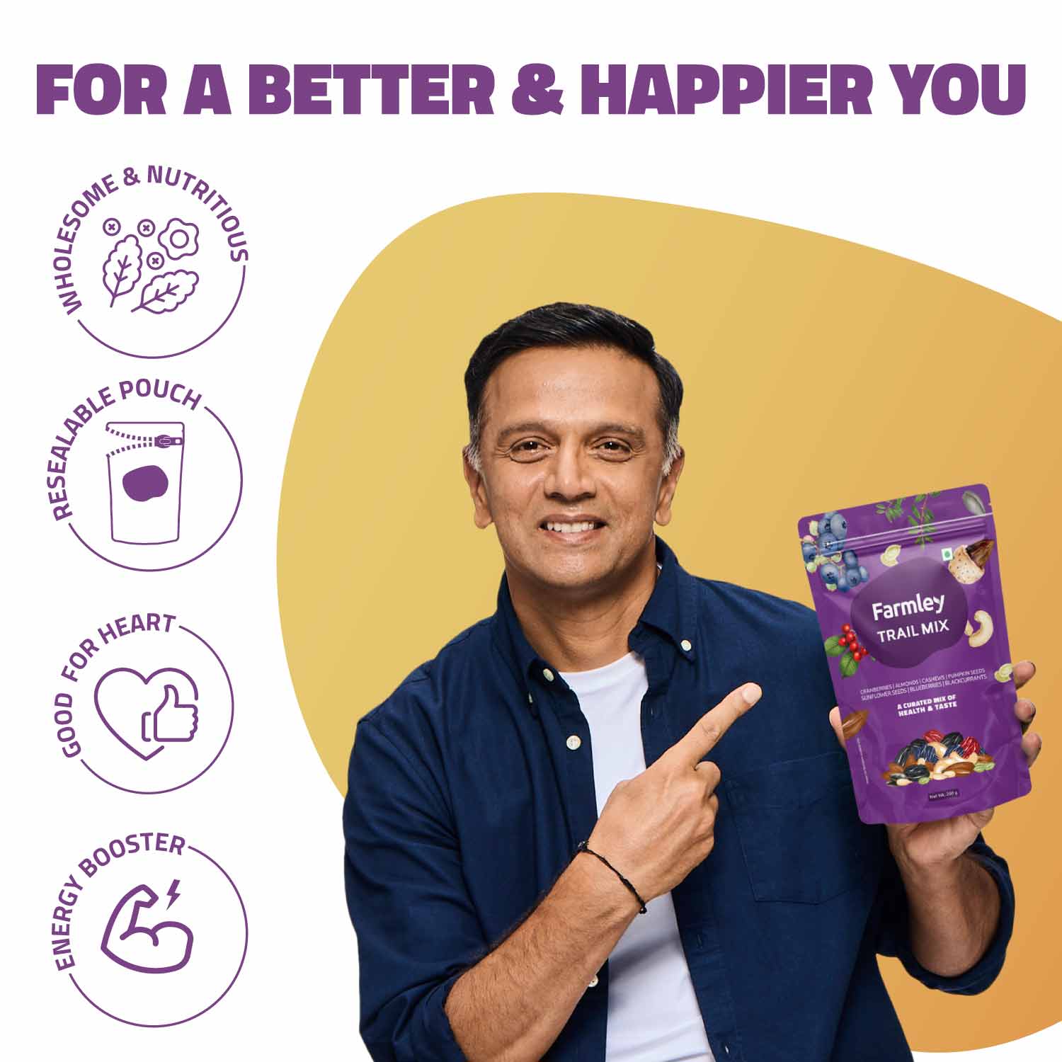 Farmley's Trail Mix is a handpicked blend of 7 premium dry fruits, nuts, dried berries, and seeds. Bringing together the goodness of - Almonds, Blackcurrant, Cashews, Sunflower Seeds, Blueberries, Pumpkin Seeds & Cranberries, it's a perfect on-the-go snack. This wholesome mix provides a natural energy boost without any adulteration and is rich in protein and omega 3. Packed with antioxidants, it promotes overall wellness while satisfying your taste buds. Versatile and delicious, our trail mix can either be enjoyed straight from the pack or sprinkled over yogurt, or incorporated into recipes for an extra nutritional boost.