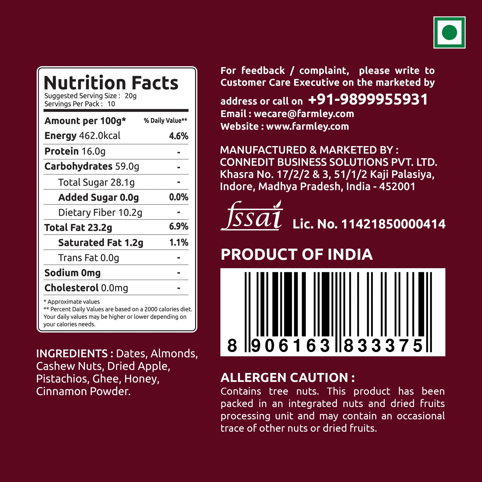 Processed, Packed & Marketed by : Connedit Business Solutions Pvt. Ltd. Khasra No. 17/2/2 & 3, 51/1/2 Kaji Palasiya, Indore Madhya Pradesh - 452001