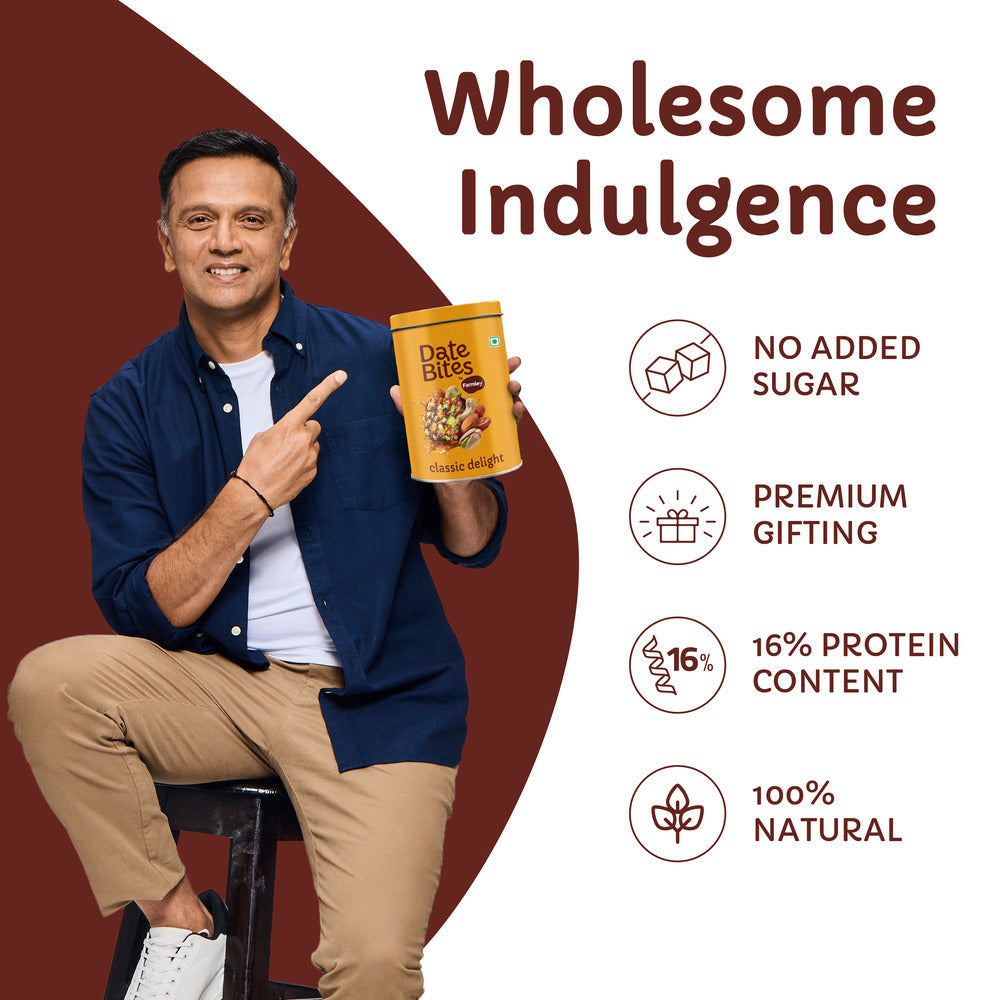 - Introducing Farmley's Date Bites, a delectable dessert crafted from 6 wholesome ingredients - Almonds, Dates, Pista, Cashews, Honey & Ghee.