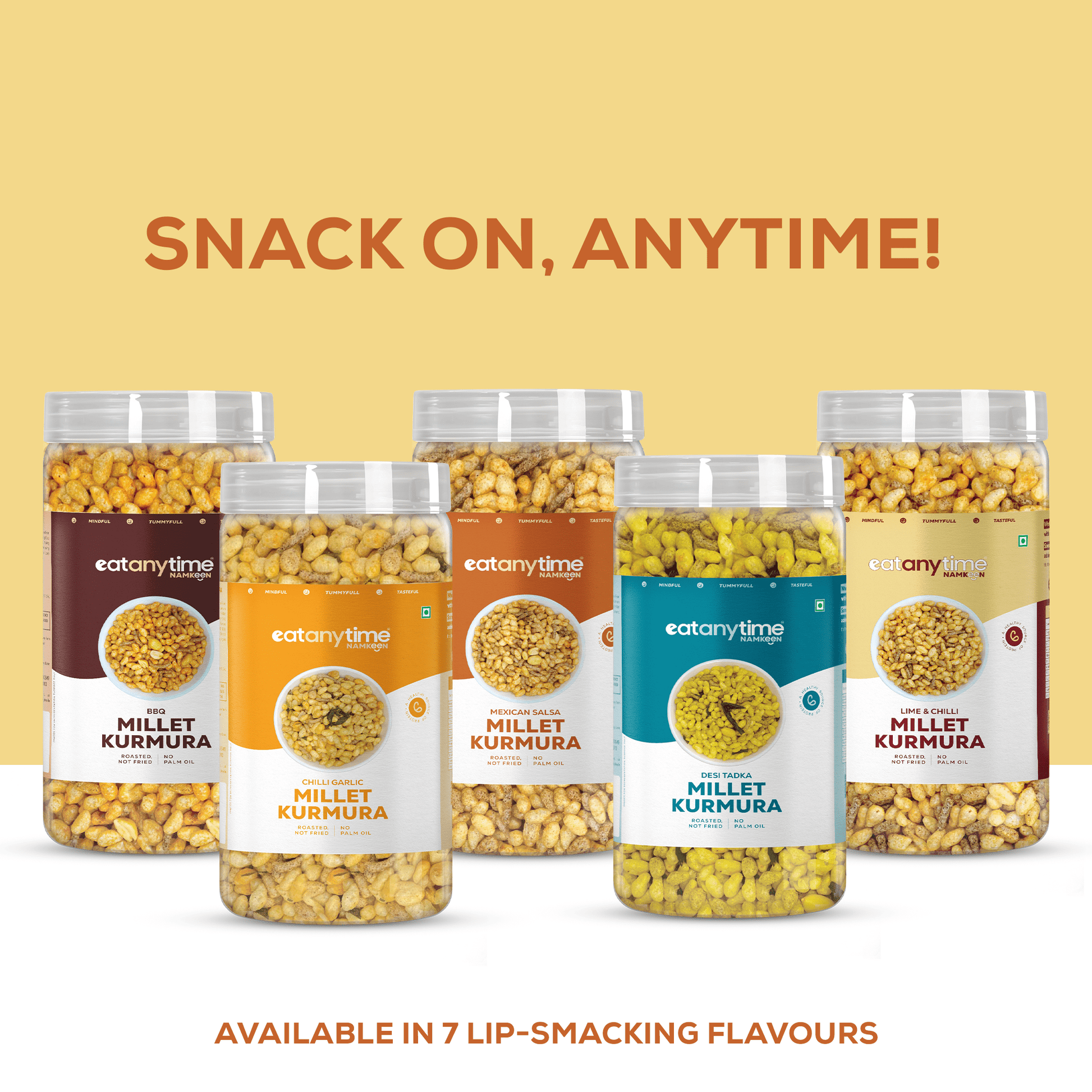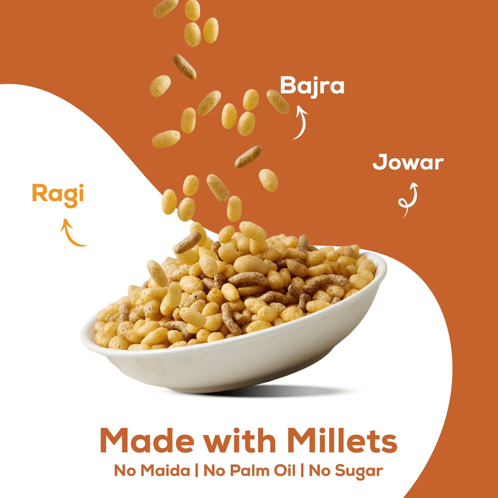 A first-of-its-kind snack, our Mexican Salsa Millet Kurmura is a crunchy, better-for-you twist on your classic puffs. Air-roasted and never fried, it’s made with a wholesome millet blend and seasoned with our signature tangy tomato flavour. With less oil and zero trans fats, it’s the ultimate guilt-free indulgence—perfect for every craving, anytime, anywhere.