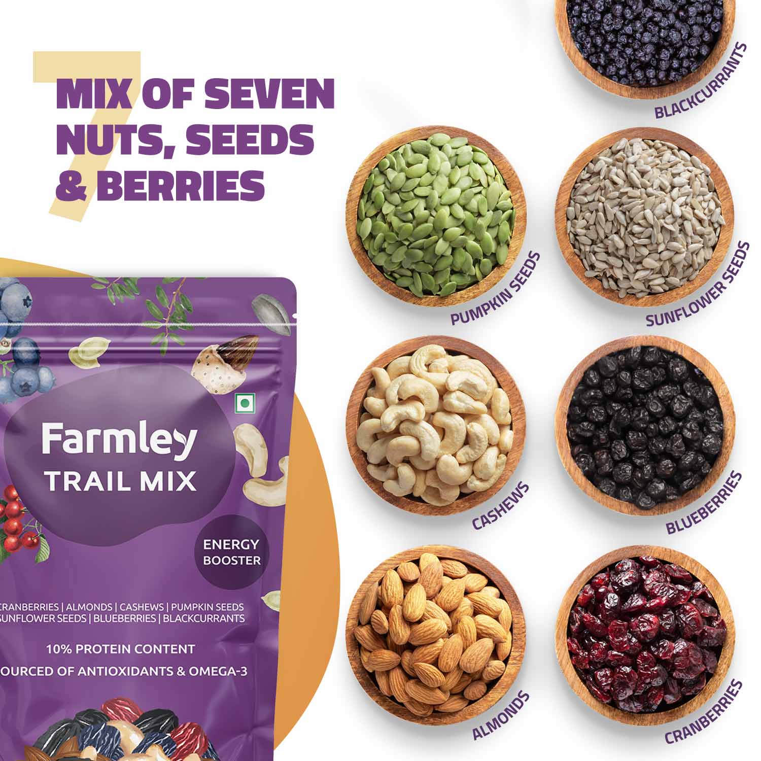 - Farmley's Mixes have been curated from our signature Dry Fruits, Nuts, Dried Berries & Seeds.