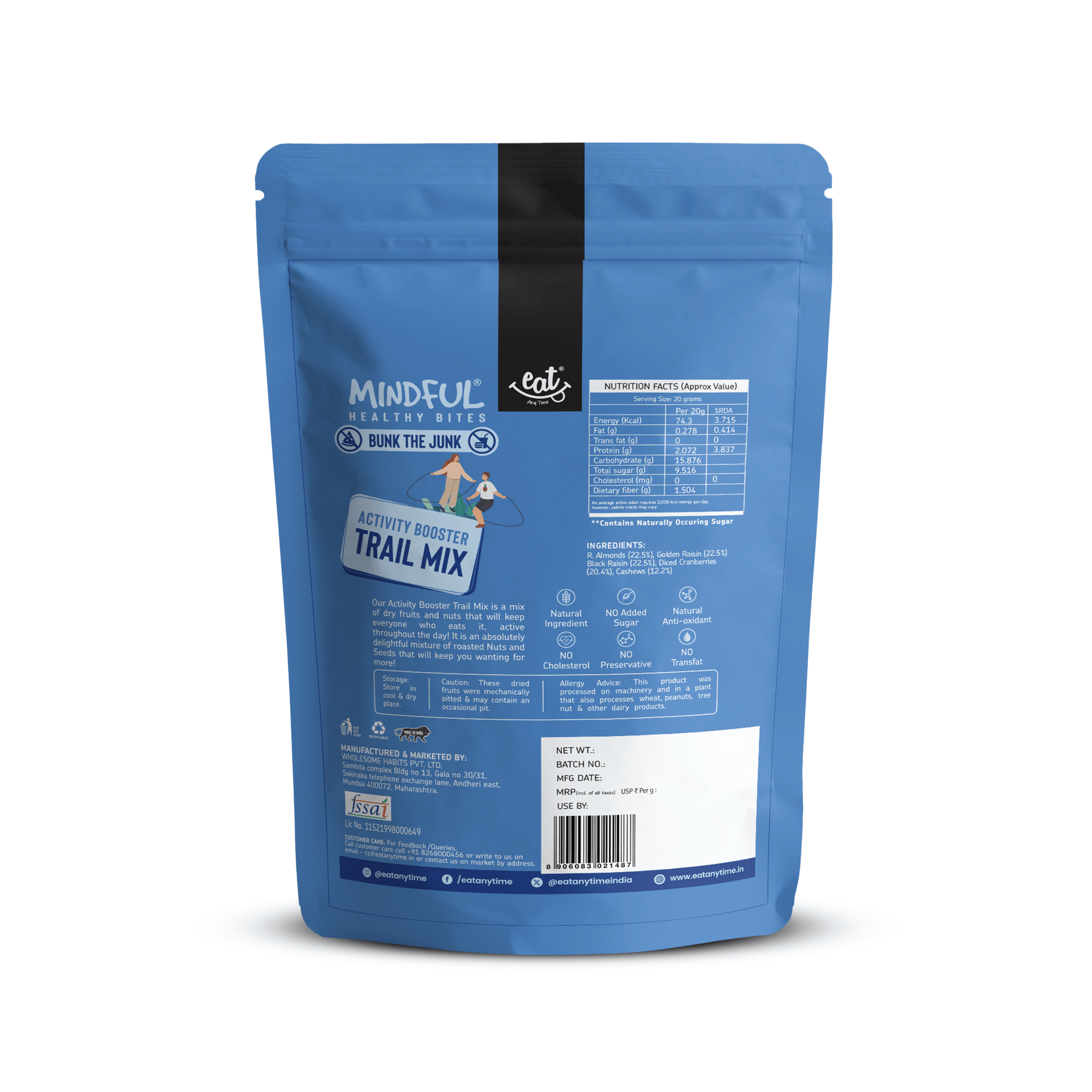 Activity Booster Nut Mix - a delicious blend of roasted almonds, cashews, cranberries, and raisins that delivers both taste and nutrition. Packed with protein, fibre, and antioxidants, this mix supports heart health, immunity, and glowing skin. With no added sugar, trans-fat, or preservatives, it’s clean snacking made easy.
