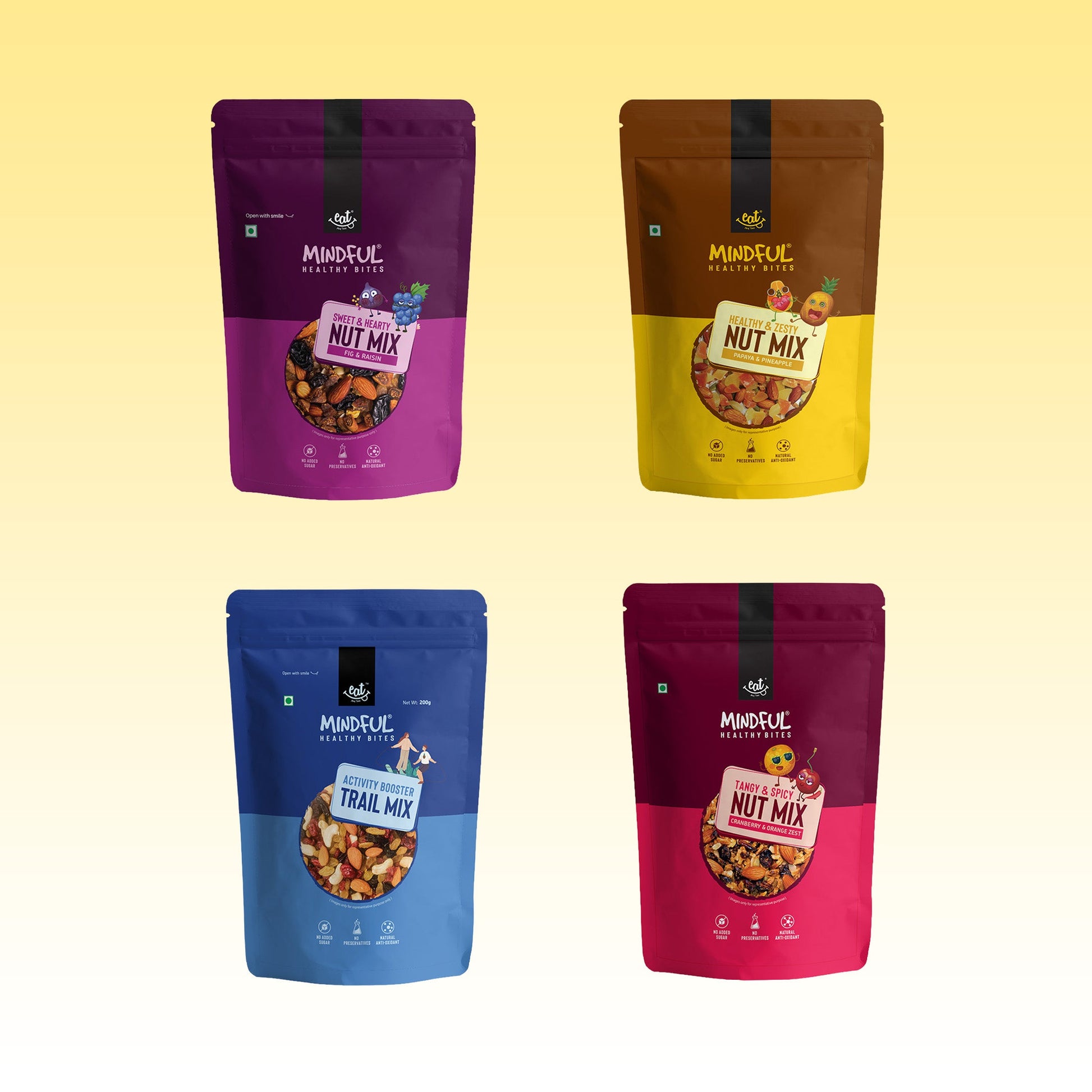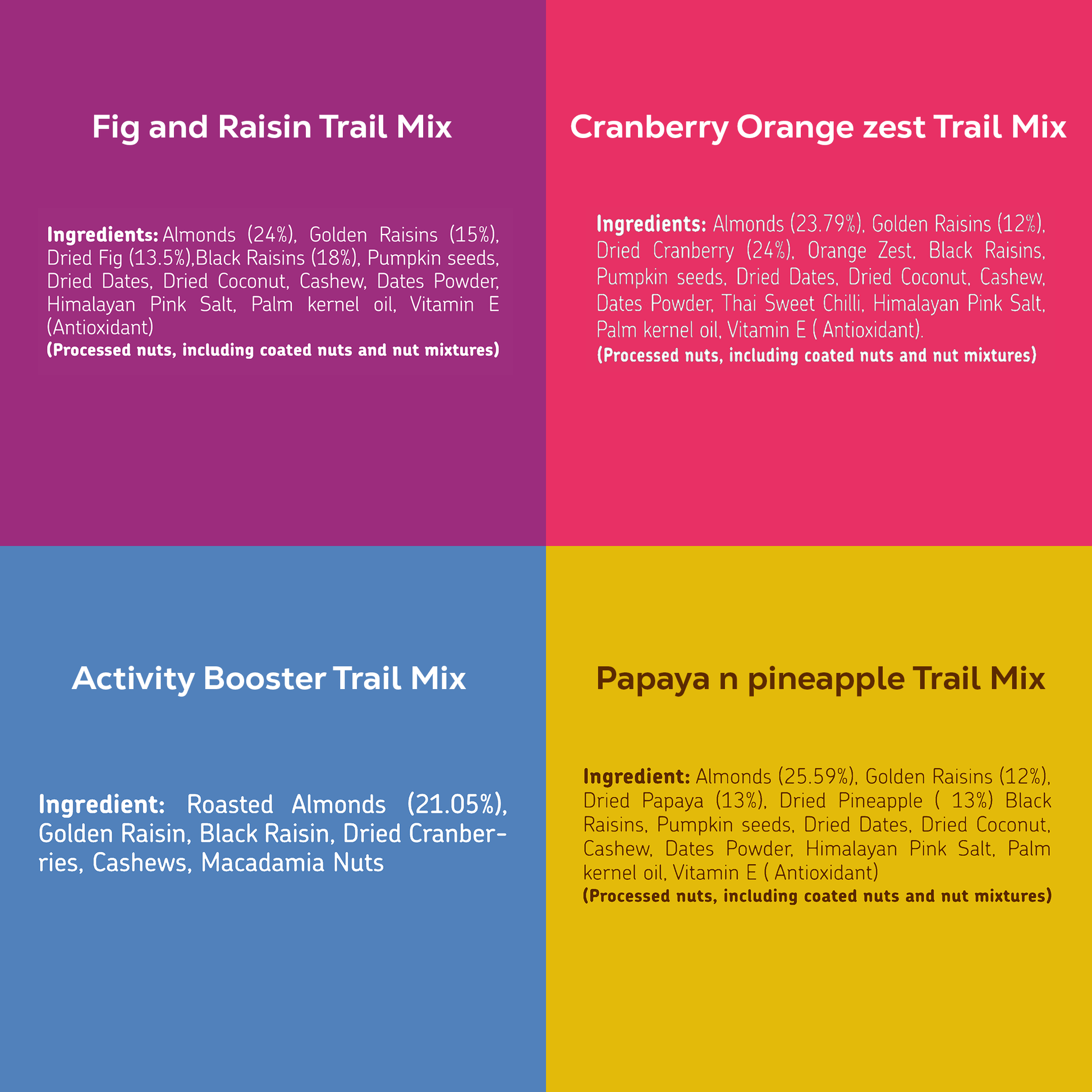 Cranberry & Orange Zest Trail Mix blends tangy cranberries, citrusy orange peel, crunchy almonds & cashews, and a dash of Thai sweet-chilli heat. Naturally sweetened with dates and free from added sugar, trans-fat, or cholesterol, it delivers clean, crave-worthy energy you can enjoy anytime—totally guilt-free.