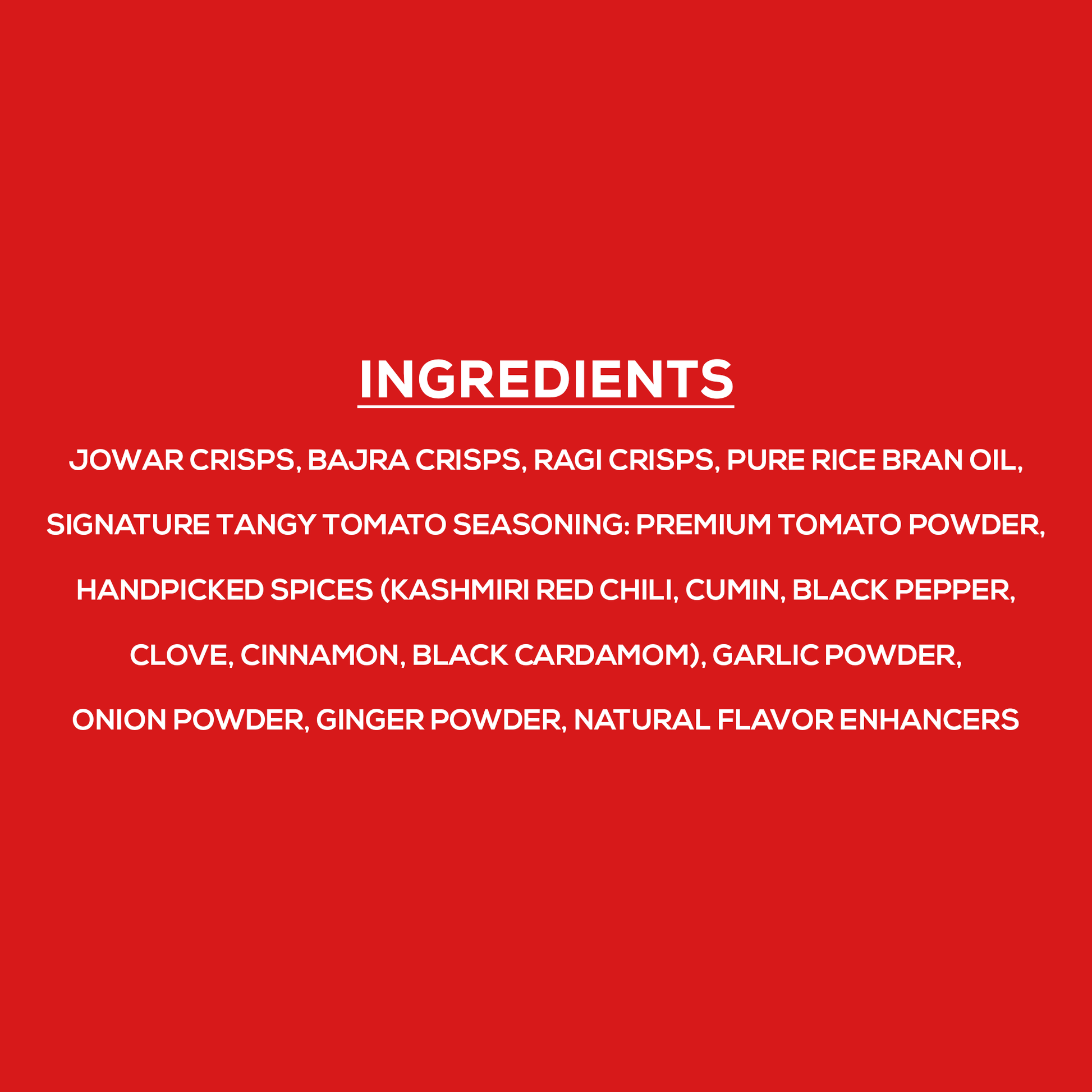 A first-of-its-kind snack, our Tangy Tomato Millet Kurmura is a crunchy, better-for-you twist on your classic puffs. Air-roasted and never fried, it’s made with a wholesome millet blend and seasoned with our signature tangy tomato flavour. With less oil and zero trans fats, it’s the ultimate guilt-free indulgence—perfect for every craving, anytime, anywhere.